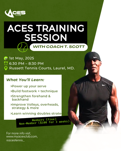 June 12 @ 6:30 pm - June 19 @ 8:00 pm Aces Training Session – Batch B Tennis Court, Laurel MD, United States
